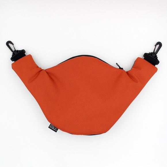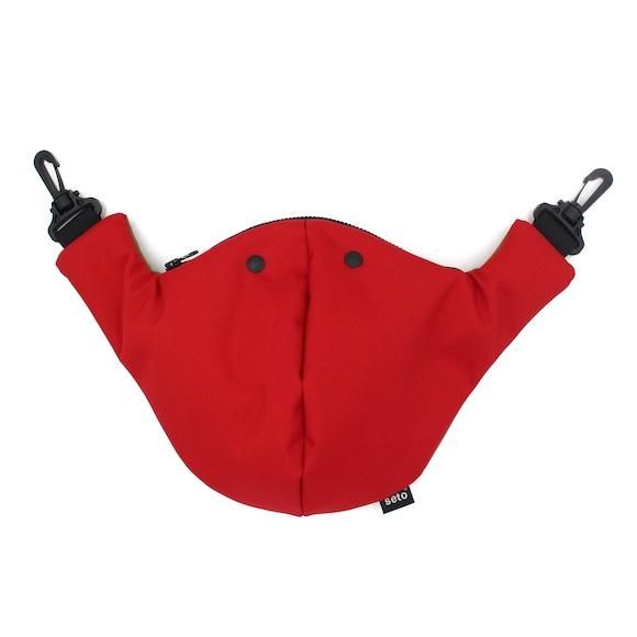 からだは中綿入りで、お腹のなかに飲み込んだものを守ります。手の先はプラスチックフック。付属の長さ調節可能なストラップを取り付けると、ななめがけや腰につけることができます。両手をつないでハンドバッグに、トートバッグやリュックにぶらさげることも。口のなかはオレンジ色のナイロン。目の裏側には取り外し可能なポケット付き。