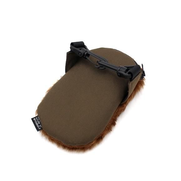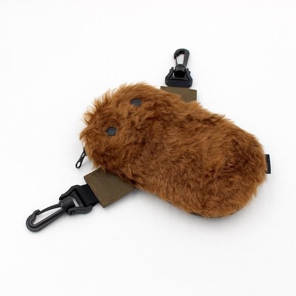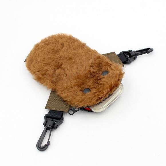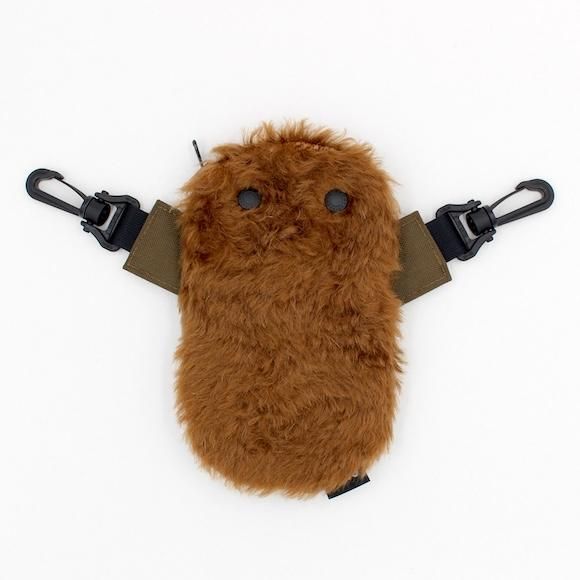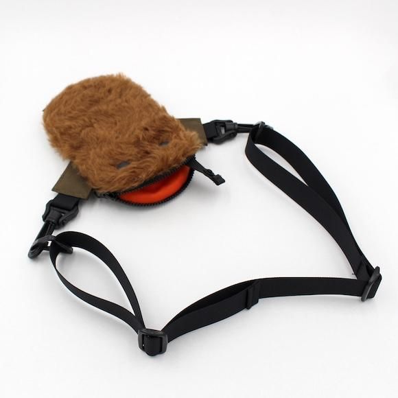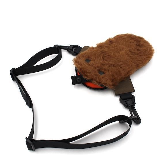からだは中綿入りで、お腹のなかに飲み込んだものをしっかり守ります。手の先はプラスチックフック。長さ調節可能なストラップを取り付けると、ななめがけや腰につけることができます。両手をつないでトートバッグやリュックにぶらさげることも。口のなかはオレンジ色のナイロン。目の裏側のベルトは取り外し可能で、キーホルダーにしたり、ストラップを通したり、何かをひっかけたりして使うことができます。