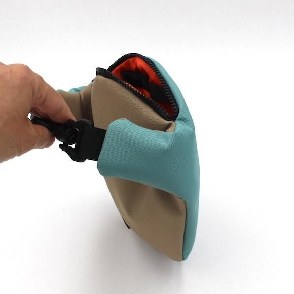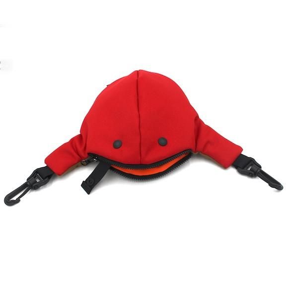 からだは中綿入りで、お腹のなかに飲み込んだものを守ります。手の先はプラスチックフック。付属の長さ調節可能なストラップを取り付けると、ななめがけや腰につけることができます。両手をつないでハンドバッグに、トートバッグやリュックにぶらさげることも。口のなかはオレンジ色のナイロン。目の裏側のベルトは取り外し可能で、キーホルダーにしたり、ストラップを通したり、何かをひっかけたりして使うことができます。